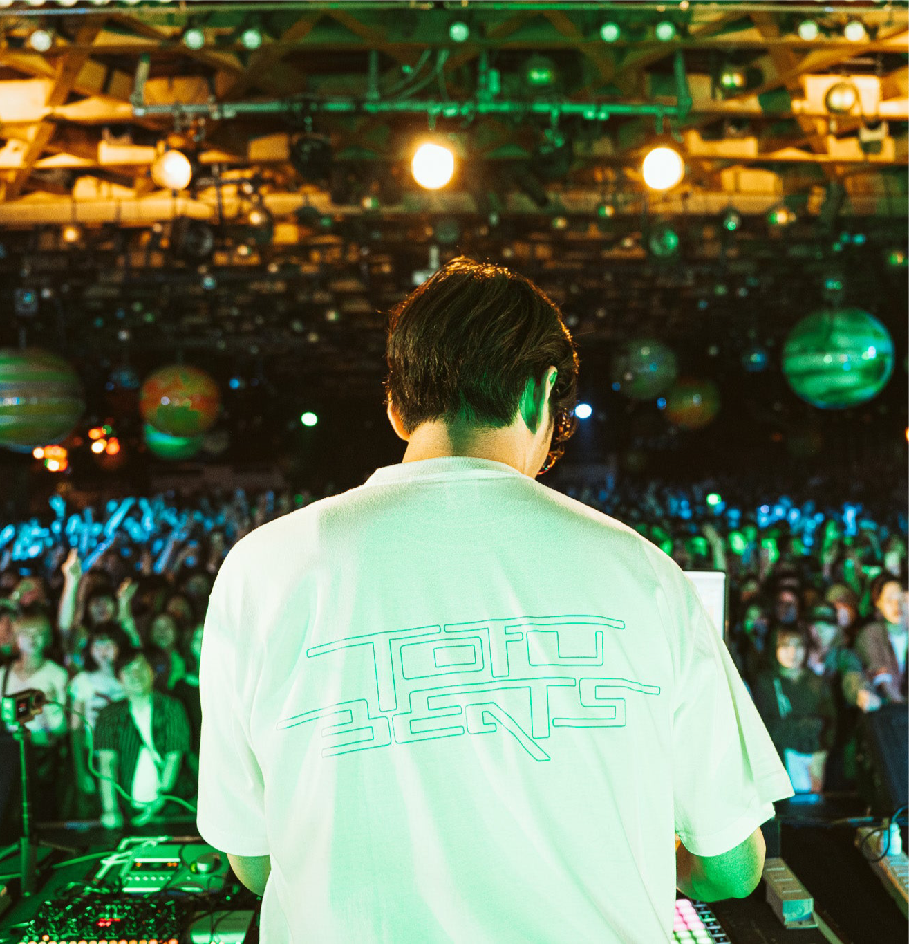 tofubeatsのロゴを背中にあしらったTシャツ。