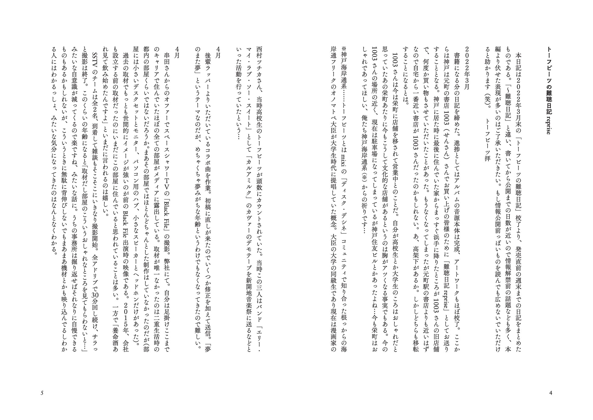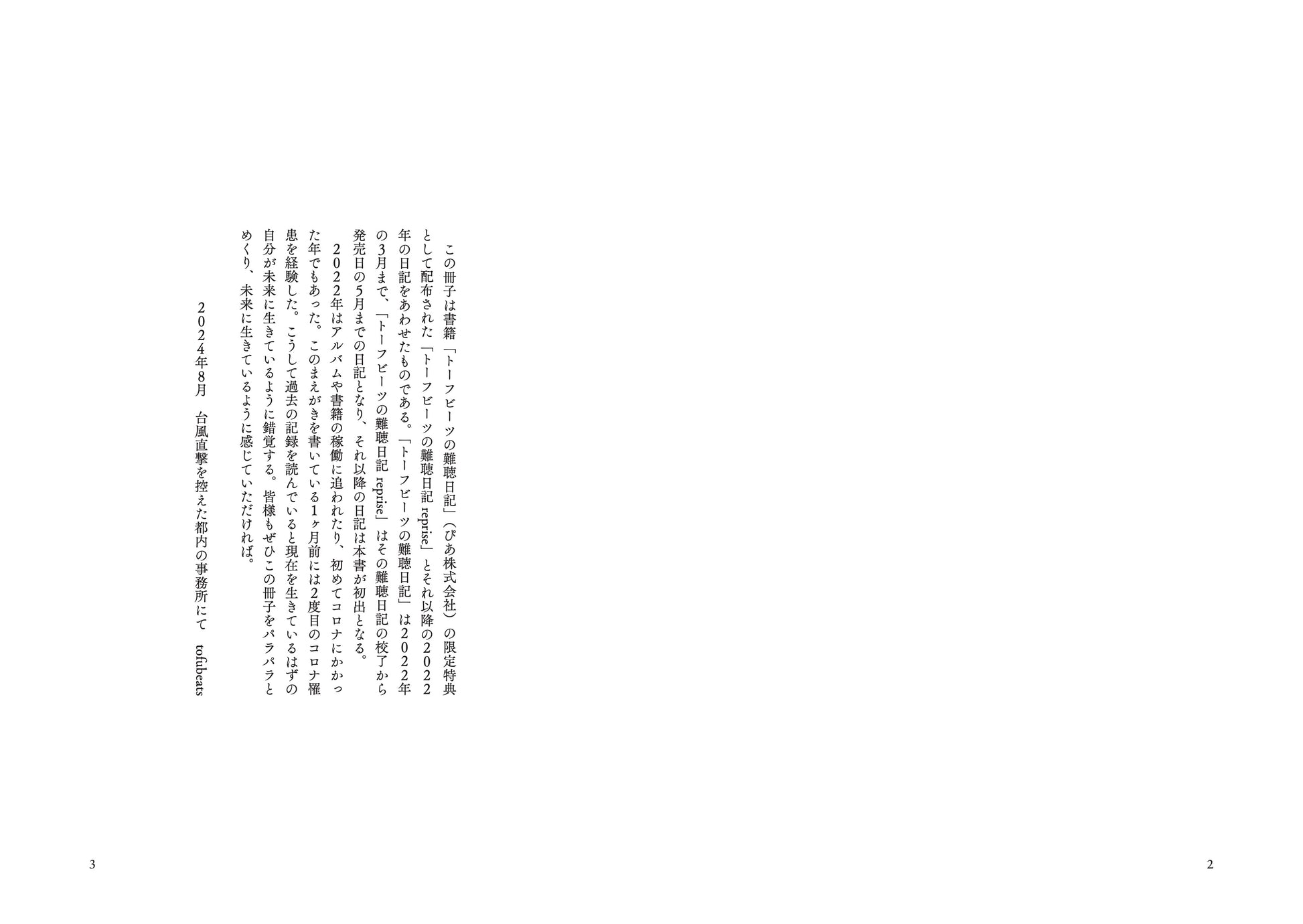 tofubeatsの初書籍、「トーフビーツの難聴日記(2022)」より早数年、その後も淡々としたためられ続けていたtofubeatsの日記の続編がZINEになりました。 2022年の初頭までの日記が収められた「トーフビーツの難聴日記」。その続編として数店舗のみで特典と して配布された1ヶ月分の日記「難聴日記 reprise」に、本書が初出となる2022年の5月以降の日記をさらに追加。難聴を経て始まった「難聴日記」はコロナ禍日記へとスライドし、2022年も初のコロナ罹患や結婚式、はたまた契約トラブルなどエピソードが巻き起こります。そして今回も音楽を生業とする人間のライフスタイルが少し覗ける1冊にもなっているかもしれません。